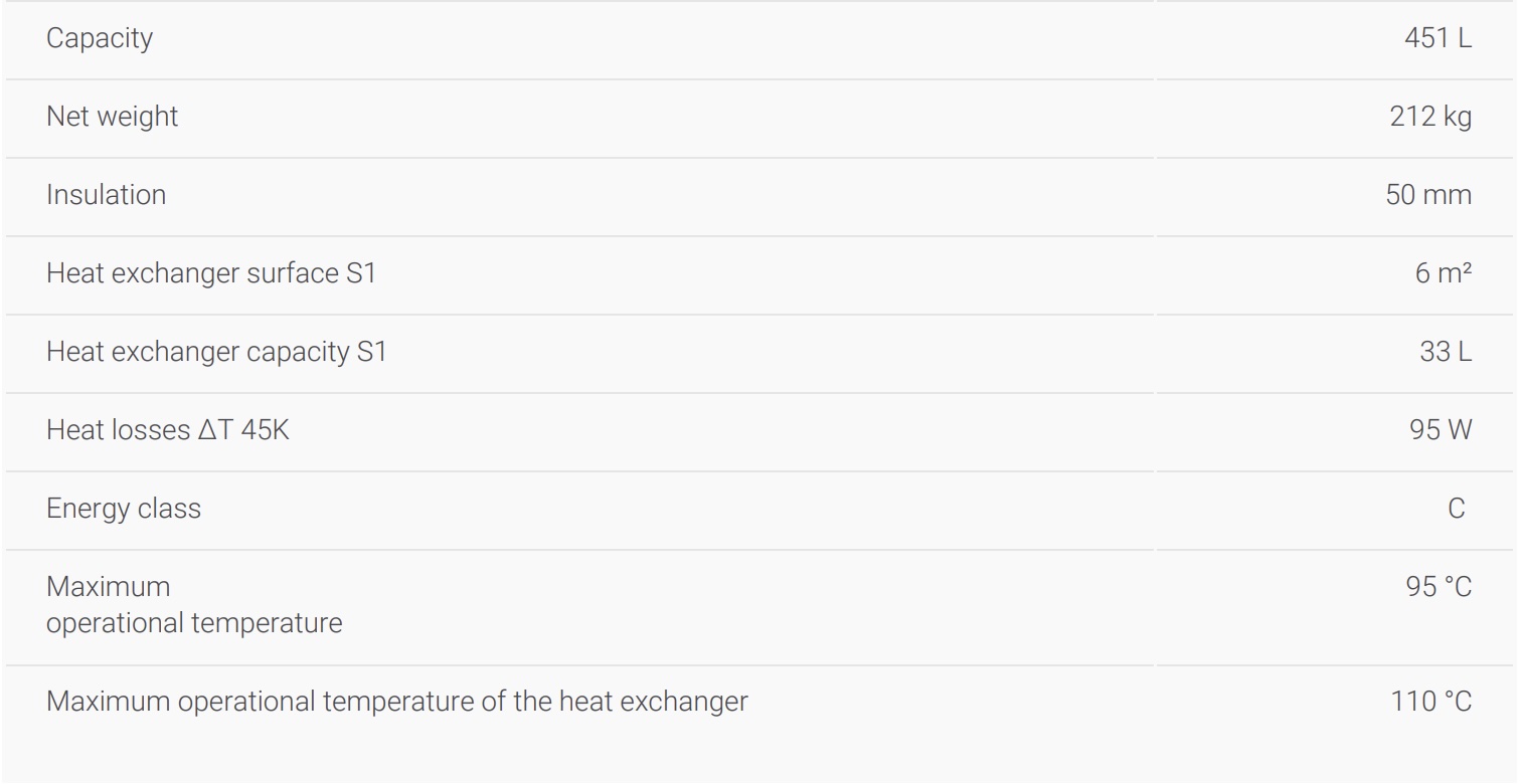 Tehokas ja suurikokoinen 451 litran käyttövesivaraaja, suunniteltu erityisesti lämpöpumppujen yhteyteen. Varustettu suuren pinta-alan omaavalla 6,0 m² lämmönsiirtokierukalla, joka mahdollistaa nopean ja tehokkaan veden lämmityksen myös matalilla lämpötiloilla.
